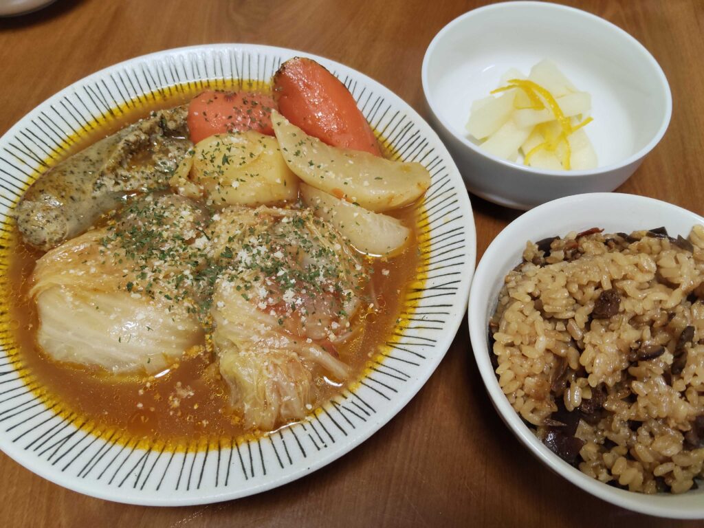 アルファ化米に付属する五目の具材を活用した炊き込みご飯、いただいた「ゆず」を活用してゆず大根をつくりました。